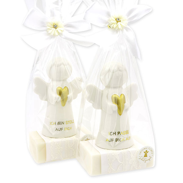 Sheep milk soap square 150g decorated with guardian angel with heart in a cellophane bag, Classic/Christmas rose white