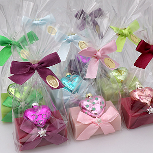Schafmilchseife eckig 100g, dekoriert mit Glasherz bunt in Cello, sortiert