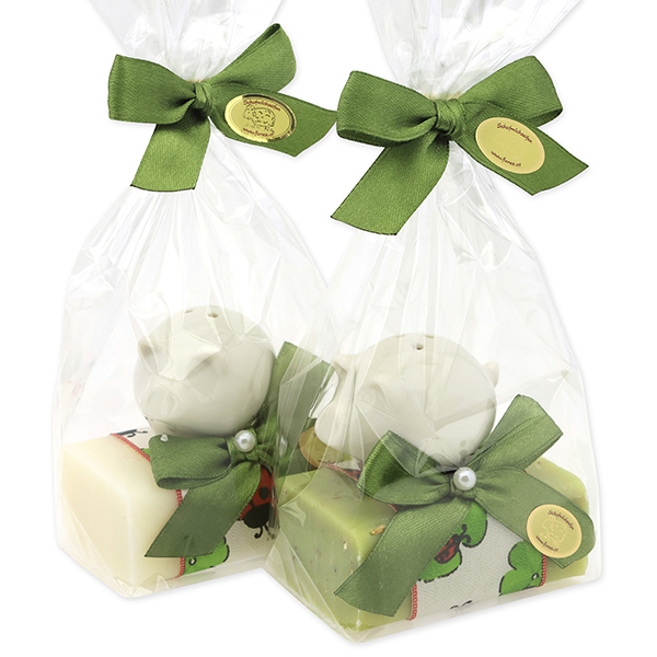 Schafmilchseife eckig 100g dekoriert mit Glücksschwein in Cello, Classic/Eisenkraut