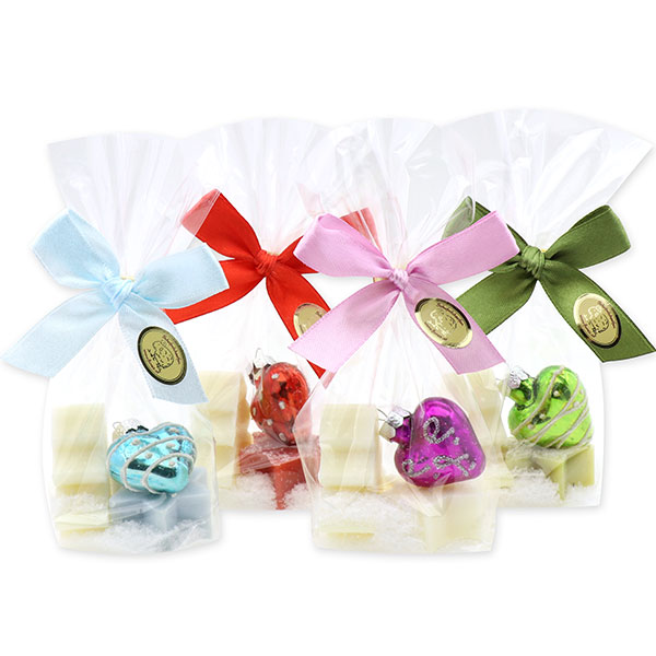 Schafmilchseife Baum 16g und Stern 12g, dekoriert mit Glasherz in Cello, sortiert