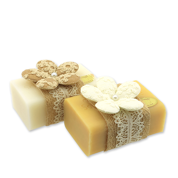 Schafmilchseife eckig 100g dekoriert mit Blume, Classic/Zirbe