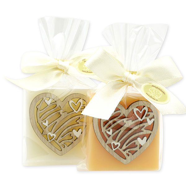 Schafmilchseife Quadrat 35g dekoriert mit Herz in Cello, Classic/Zirbe