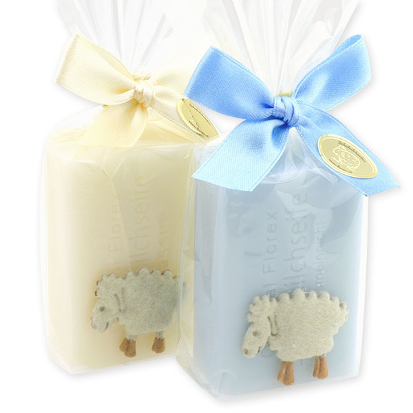 Schafmilchseife eckig 100g dekoriert mit Filz Schaf in Cello, Classic/Vergissmeinnicht