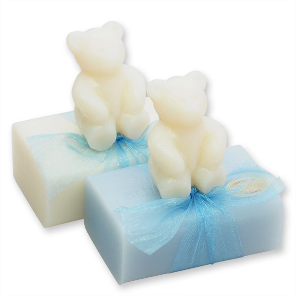 Schafmilchseife eckig 100g dekoriert mit Seife Teddy 25g, Classic/Vergissmeinnicht
