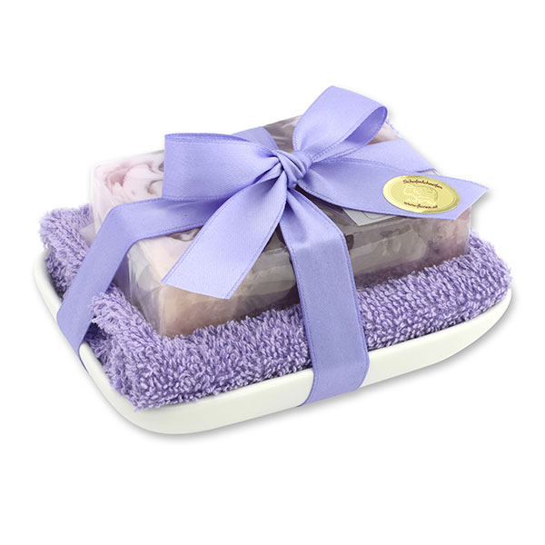 Handgemachte Glyzerin-Seife 90g in Folie auf Seifenschale, Lavendel