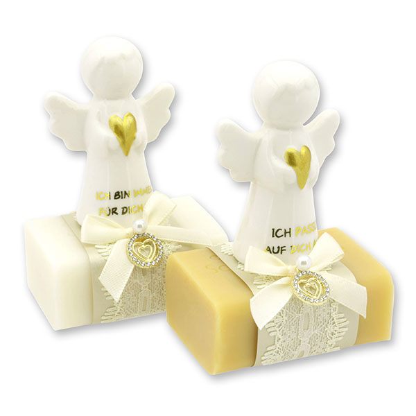 Schafmilchseife eckig 100g dekoriert mit Schutzengel mit Herz, Classic/Zirbe