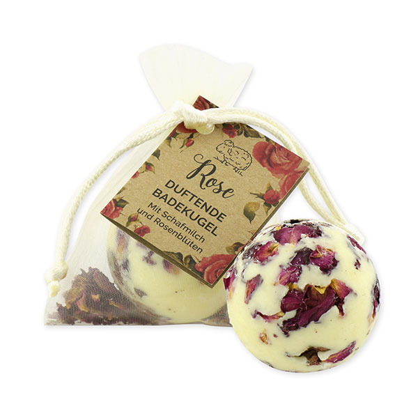 Badebutter-Kugel mit Schafmilch 50g im Organzasackerl "Wohlfühlzeit", Rose mit Blüten